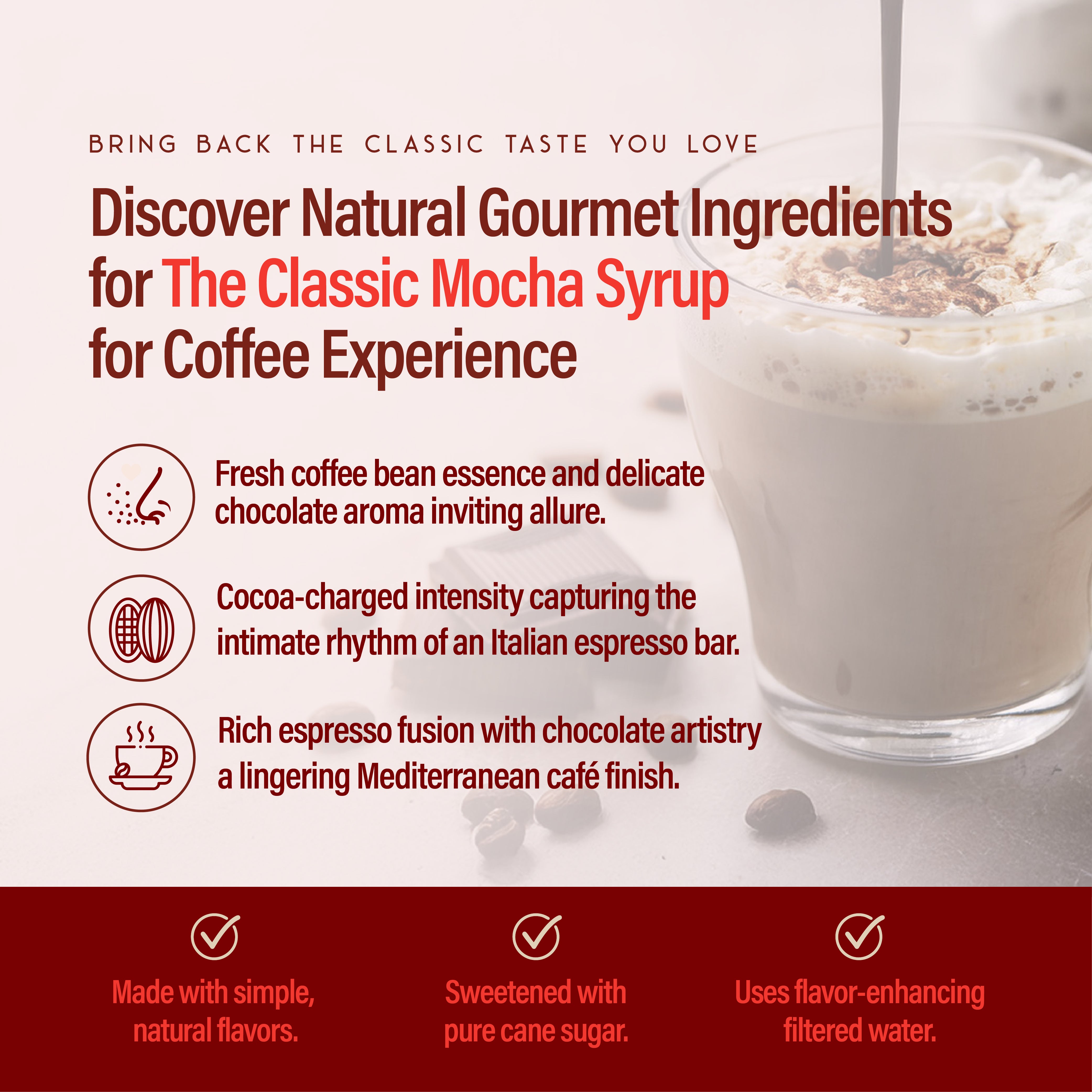 A lingering fusion of espresso and cocoa mirrors the charm of a Mediterranean café, wrapped in the velvety depth of premium Mocha Flavor Syrup.